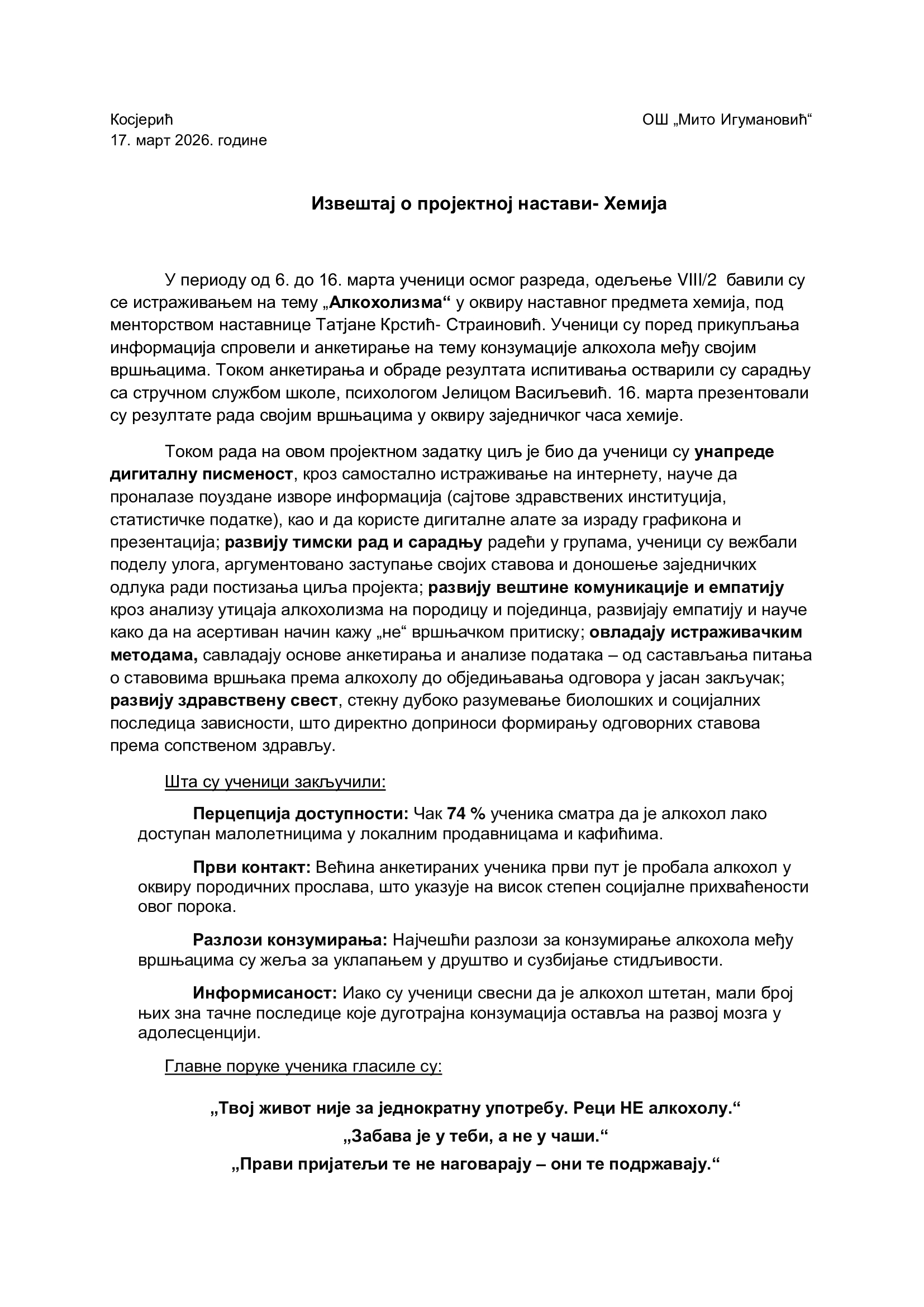 Алкохолизам - пројектна настава